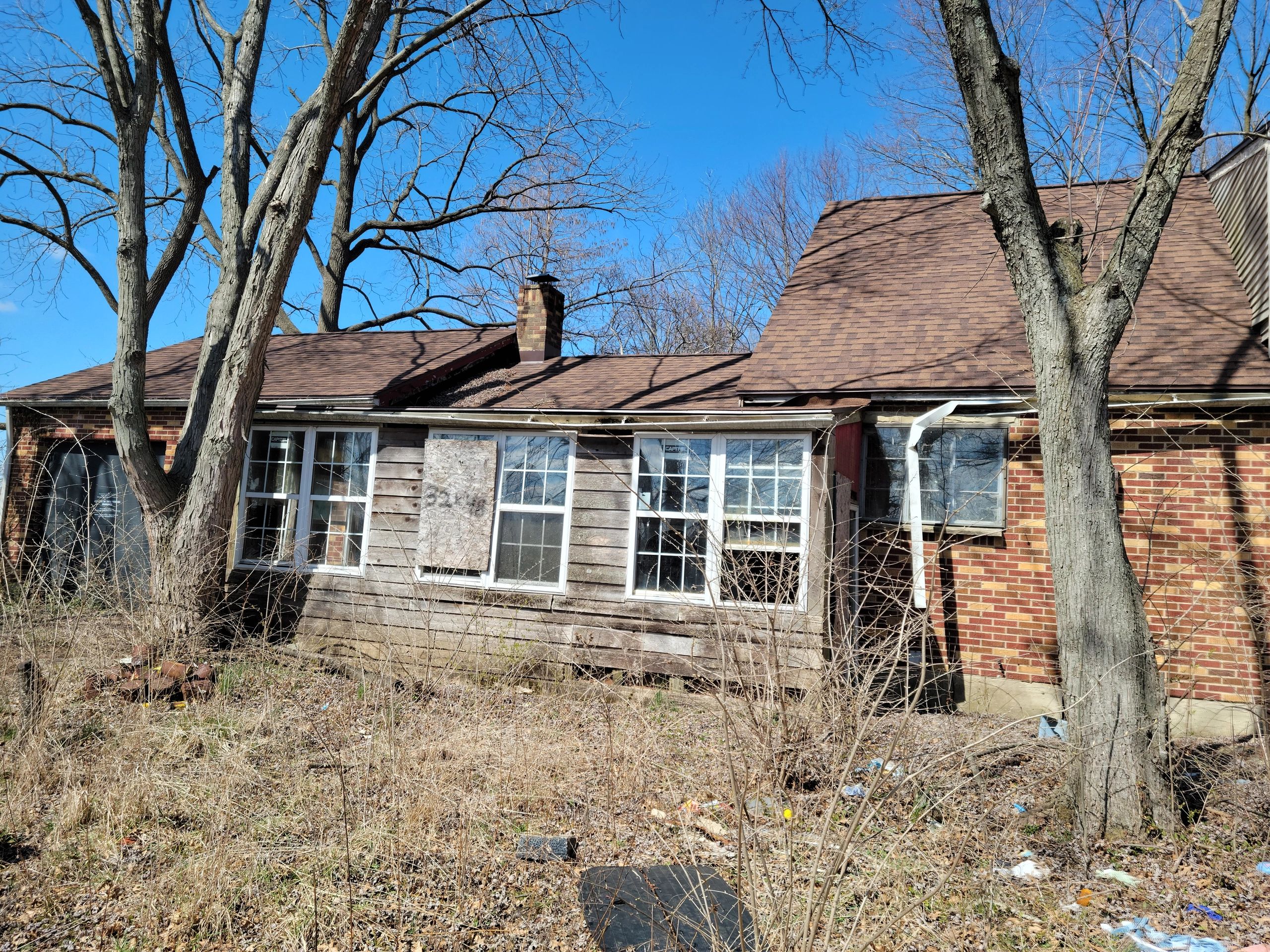 Before receivership intervention: boarded and broken windows, structural decay, vandalism, and long-term neglect left the property unsafe, vacant, and draining neighborhood value.